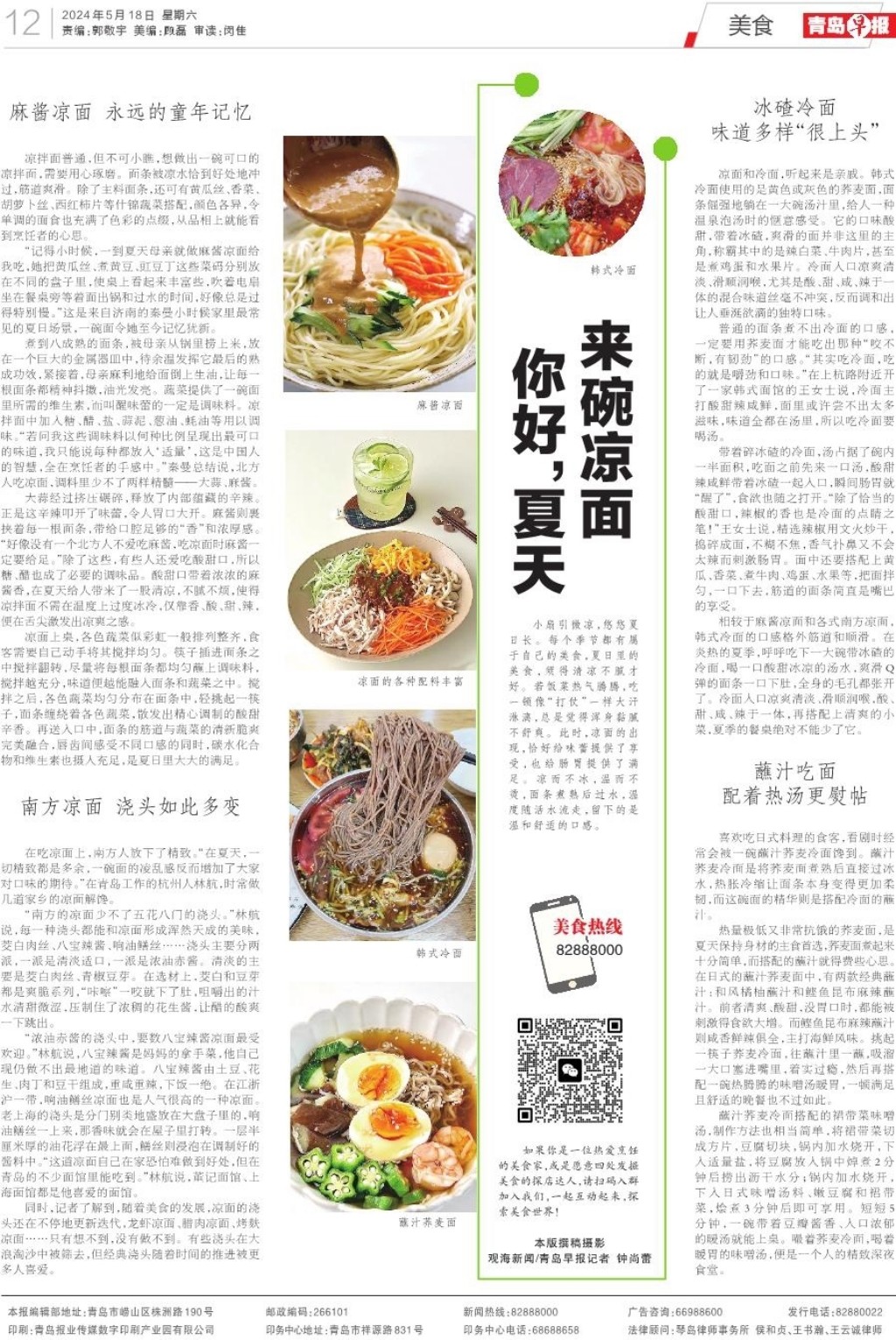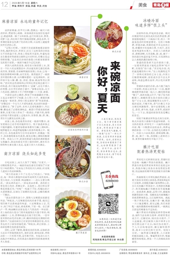 “记得小时候,一到夏天母亲就做麻酱凉面给我吃,她把黄瓜丝、煮黄豆、豇豆丁这些菜码分别放在不同的盘子里,使桌上看起来丰富些,吹着电扇坐在餐桌旁等着面出锅和过水的时间,好像总是过得特别慢。”这是来自济南的秦曼小时候家里最常见的夏日场景,一碗面令她至今记忆犹新。