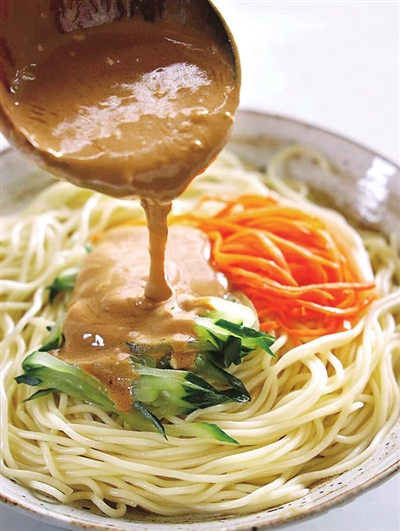 大蒜经过挤压碾碎,释放了内部蕴藏的辛辣。正是这辛辣叩开了味蕾,令人胃口大开。麻酱则裹挟着每一根面条,带给口腔足够的“香”和浓厚感。“好像没有一个北方人不爱吃麻酱,吃凉面时麻酱一定要给足。”除了这些,有些人还爱吃酸甜口,所以糖、醋也成了必要的调味品。酸甜口带着浓浓的麻酱香,在夏天给人带来了一股清凉,不腻不烦,使得凉拌面不需在温度上过度冰冷,仅靠香、酸、甜、辣,便在舌尖激发出凉爽之感。