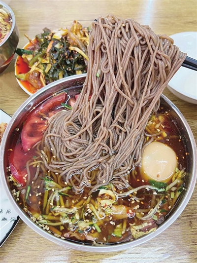 普通的面条煮不出冷面的口感,一定要用荞麦面才能吃出那种“咬不断,有韧劲”的口感。“其实吃冷面,吃的就是嚼劲和口味。”在上杭路附近开了一家韩式面馆的王女士说,冷面主打酸甜辣咸鲜,面里或许尝不出太多滋味,味道全都在汤里,所以吃冷面要喝汤。