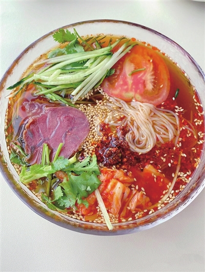 带着碎冰碴的冷面,汤占据了碗内一半面积,吃面之前先来一口汤,酸甜辣咸鲜带着冰碴一起入口,瞬间肠胃就“醒了”,食欲也随之打开。“除了恰当的酸甜口,辣椒的香也是冷面的点睛之笔!”王女士说,精选辣椒用文火炒干,捣碎成面,不糊不焦,香气扑鼻又不会太辣而刺激肠胃。面中还要搭配上黄瓜、香菜、煮牛肉、鸡蛋、水果等,把面拌匀,一口下去,筋道的面条简直是嘴巴的享受。