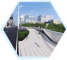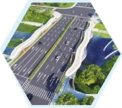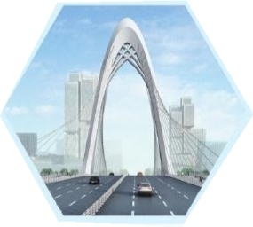 科技园五路桥梁设计为三跨上承式空腹箱形拱桥,长115米,跨径为32.5米+50米+32.5米,车行道双向四车道,人行道宽度曲线变宽,桥梁总宽为21—27米。