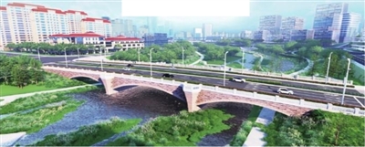 新南路桥梁设计为三跨连续拱桥,长104米,跨径布置为32米+40米+32米,车行道双向六车道,桥区内加设护栏及设置人行道观景平台,总宽为36—43.6米。