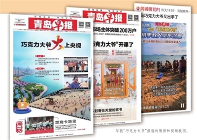 陈爱国、咸博、宁健三人跳海救人的事迹,再次掀起了大家对青岛“巧克力大爷”的点赞热潮。2023年6月份以来,因外地游客的一条视频,青岛海滩上的“巧克力大爷”成为“网红”。去年7月20日,青岛早报首发的独家视频《青岛巧克力大爷又出手了》,报道了青岛第一海水浴场沙滩上的一次救援行动,立刻引来全国网友的点赞和留言,冲上抖音同城榜第一的位置。随后,央视新闻频道《新闻周刊》栏目联系青岛早报记者,一起专题采访了“巧克力大爷”及救人过程,将青岛“巧克力大爷”这一名词推向全国,人民日报、新华社等新媒体平台,也纷纷编发了青岛早报的“巧克力大爷”报道。
