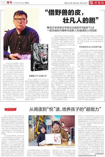 全民阅读的氛围日渐浓厚,社会、学校、家庭三者的合力也在助力着孩子们的阅读习惯,余治莹更希望孩子们把通过阅读得到的知识化成能力,应用在各个学科上,“应用之后,还要让孩子有机会表达出来,用说、写、画、演等方式。”这也正是余治莹所强调的阅读素养,“读书不再只是吸收知识,而是培养孩子的阅读素养。”阅读素养首先是让孩子多元阅读,而且要读懂内容;其次是让孩子把所得到的知识化成各种各样的能力,包含写作力、逻辑力等,这些能力才是终身带不走的;其三,孩子在读书的时候,希望他们是有兴趣的,是开心的、积极的。但是从“阅读”到“悦读”,一字之差却有着本质的区别,区别在于更多照顾孩子的情绪,并激发主动阅读的动力。 本版撰稿摄影 观海新闻/青岛早报记者 周洁