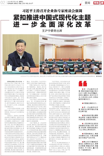 新华社济南5月23日电 中共中央总书记、国家主席、中央军委主席习近平5月23日下午在山东省济南市主持召开企业和专家座谈会并发表重要讲话。他强调,党的二十大擘画了全面建设社会主义现代化国家的宏伟蓝图,确立了以中国式现代化全面推进强国建设、民族复兴伟业的中心任务。进一步全面深化改革,要紧扣推进中国式现代化这个主题,突出改革重点,把牢价值取向,讲求方式方法,为完成中心任务、实现战略目标增添动力。