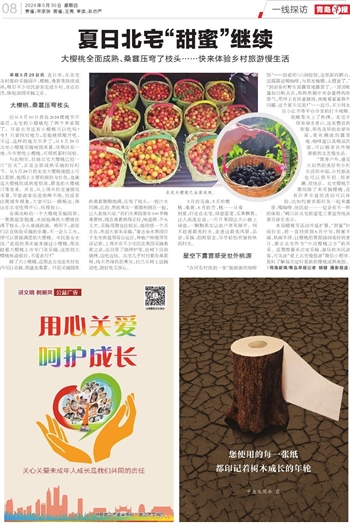 早报5月29日讯 连日来,在北宅各村落的采摘园中,樱桃、桑葚等陆续成熟,吸引不少市民游客走进乡村、亲近自然,体验游园采摘之乐。