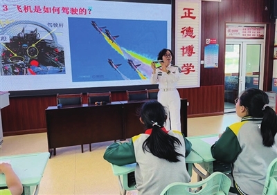 这是一场与“天空对话”的国防教育思政课,张丹峰书记是原海军航空大学青岛校区飞机教研室副教授,她结合自身经历,多年的教学经验,以“飞机为什么能飞起来?”“飞机是如何操纵的?”飞机的发展历程等问题作为切入点,利用飞机模型现场演练,开展“沉浸式宣讲”,使学生更深入地、直观地理解空气动力学的知识。