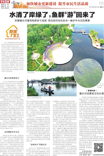“在即墨生活了几十年,很少在墨水河里见到这样壮观的鱼群。感觉生态环境真的越来越好了。”不少居民把拍到的鱼群视频发到了网上,一时间引来更多人到河边看个究竟。昨天上午,记者来到龙泉河和墨水河墨城路西段看到,河两岸垂柳拂绿水,野鸭、白鹭等水鸟不时在水面上飞翔,呈现出一幅生态画卷。在一处清澈的浅水处,记者果真看到了鱼群在河底自由游动的景象,小鱼时而钻进河底的水草中嬉戏,时而跃出水面,让碧绿的水面泛起一圈圈涟漪,十分好看。