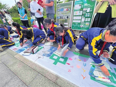 来自山东大学青岛校区和德馨小学东部分校的学生们共同在十米画卷上勾勒美丽本次活动中国的时代图景(左图)。