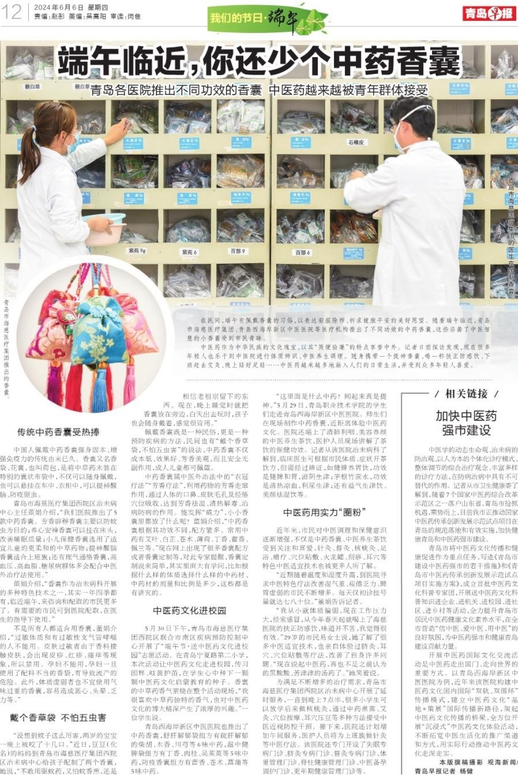 在民间,端午有佩戴香囊的习俗,以表达驱瘟除秽、祈求健康平安的美好愿望。随着端午临近,青岛市海慈医疗集团、青岛西海岸新区中医医院等医疗机构推出了不同功效的中药香囊,这些沿袭了中医智慧的小香囊受到市民青睐。