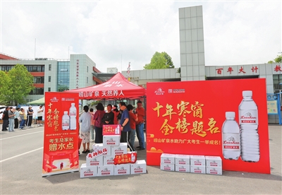 记者在现场发现,不仅仅是现场补水站的背景板写满了祝福,送出的崂矿瓶身上同样印有“金榜题名”的祝福。“感谢你们的祝福,这个我得替孩子收好了,这也是他参加高考最好的纪念。”一位考生家长说。