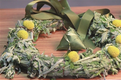 搭配艾草、黄金球等花材的艾草门挂。受访者供图