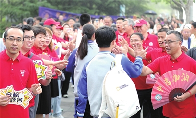 在青岛59中考点外,青岛超银学校的老师们早早就来到现场,为每一名考生送上叮咛和祝福。“我和老师们大概7点就到了,给每一个孩子送上祝福。”超银学校校长潘晓莉告诉记者,教师团队特意穿上了印有“超银必胜”的送考T恤,拿着印有“金榜题名”等标语的小牌子,为考生加油的同时,也给他们留下宝贵的青春纪念。潘晓莉说,她希望考生们能用一种轻松的心态,去享受这场属于自己的考试。