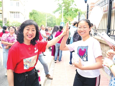 青岛第四实验初级中学两位老师为自己的第一届毕业生送考。