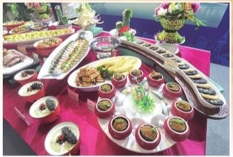 在位于青岛嘉年华会展中心一楼的民族美食特色展区,新疆牧羊先生丝路宴、西藏扎西德勒迎宾宴、贵州布依民族迎宾宴等主题宴席展吸引了大批市民观众驻足观看。身穿民族服饰的新疆小姐姐随着节拍翩然舞动,并同时为围观的嘉宾们送上当地的特色小吃。除此之外,现场展示的胶东鲅鱼宴、琴岛印象主题宴席等具有青岛传统风味的宴席也吸引了许多观众拍照打卡。