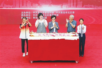 孙睿涵(左二)上台切蛋糕。观海新闻/青岛早报首席记者 孙启孟 摄
