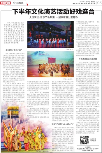 昨天,市政府新闻办召开新闻发布会,介绍青岛市2024年下半年文化演艺活动开展的相关情况。今年下半年,全市将策划推出各类文化演艺活动两万多场次,涵盖音乐节会、演艺演出、公共文化活动等多种类型,在丰富文化产品供给的同时,打造青岛旅游新热点,全面提升国际滨海旅游目的地形象。