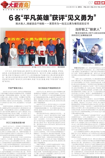 6月18日,莱西市委政法委、莱西市见义勇为协会为吴祥鹏、李伟、潘晓廷、罗阳春、姜传帅、史浩明颁发莱西市见义勇为模范荣誉证书。他们当中,有跳入池塘救人的武装部干事;有在河中救起老人的环卫工人;还有捐献造血干细胞为他人带去希望的普通市民。他们在公共利益和群众生命财产受到侵害或面临威胁时,不顾个人安危挺身而出,用实际行动诠释了新时代见义勇为精神,传递了社会正能量,彰显了青岛这座“大爱之城”的风采。