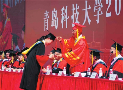 青岛科技大学校长为毕业生拨穗。学校供图