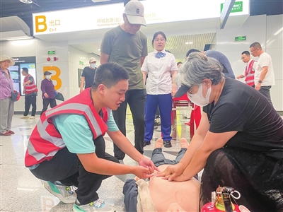 市民在志愿者指导下学习心脏按压急救方法。