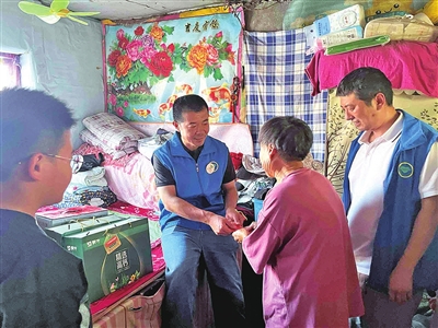 给贫困户送去现金和夏凉被、妙府老酒、牛奶等物品。