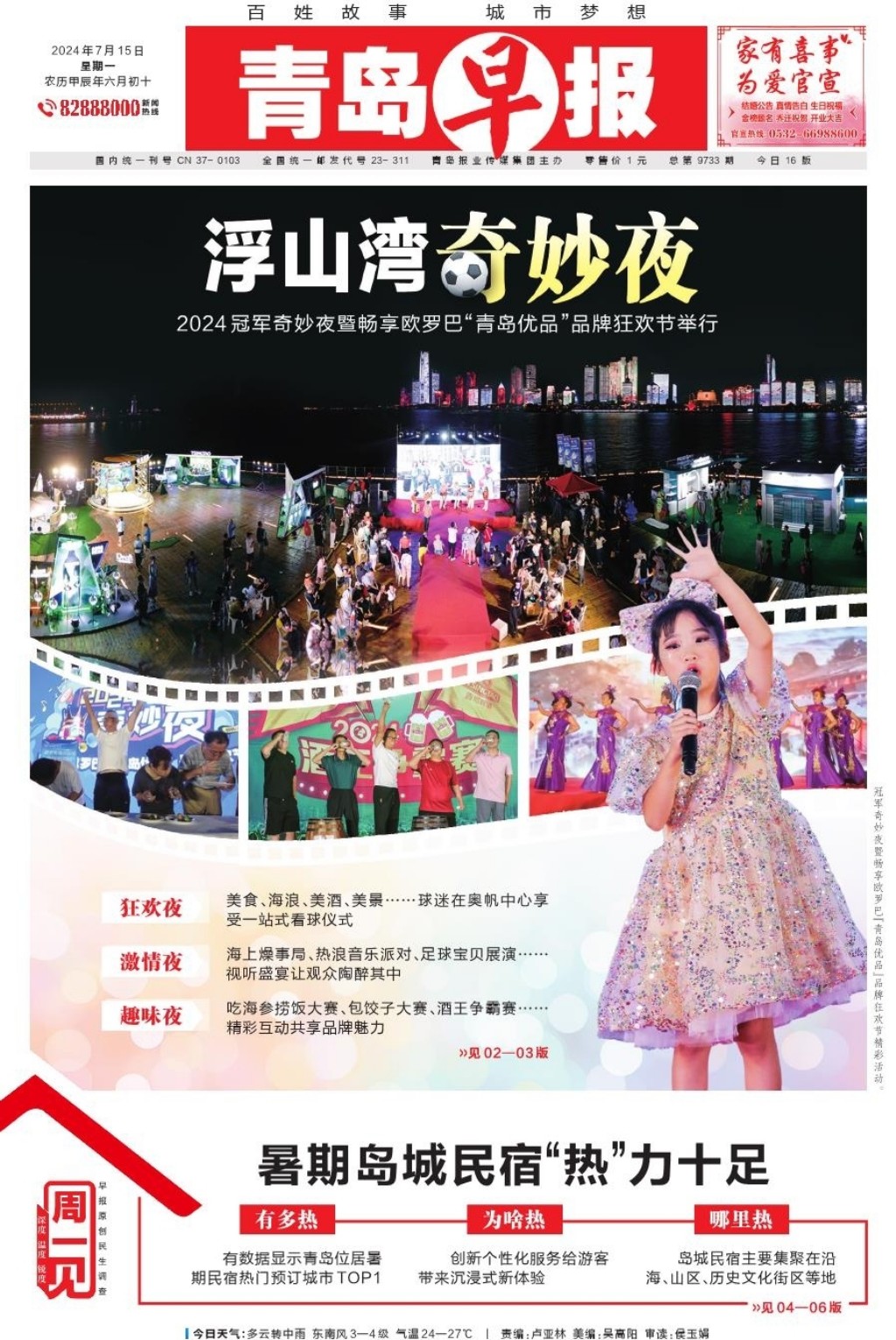 A01 头版 A02 今日看点 A04 周一见 A05 周一见 A06 周一见 A07 一线探访 A08 青岛与世界干杯 A09 青岛与世界干杯 A10 都市圈 A11 加快城市更新建设 提升市民生活品质 A12 文体 A13 瞰青岛周刊 A14 新气象 A15 观天下周刊 A16 聚焦