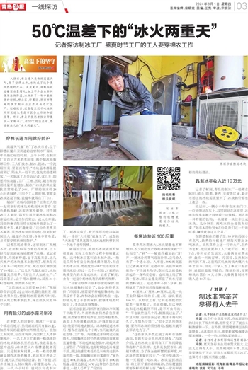 制冰厂老板冯国同妻子正和工人们一起将制好的冰块卸载到冰库暂存,室外酷热难耐,冰库内寒冷刺骨。对于制冰工人来说,每天往返于制冰车间和冰库运冰块,是工作的常态。进入冰库前,冯国的妻子陈丽珍在短袖外面套上了一件军大衣,她打趣地说,“这份冷差事并不解暑,虽然冰库里面很凉快,但要长时间出入,温度冷热交替,身体非常难受,必须要穿棉袄做好防护。”