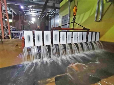 在多数人的印象中,制冰厂一定是个清凉的地方,然而清凉的只有储冰室,加工车间的温度和室外相差无几。在加工车间里,站在冰块旁,冯国和工人不停地流汗。一名工人正忙着将一格格冻好的冰块从制冰机里吊出来,放进常温水里冲洗后,冰块便从冷冻槽里脱离而出。只见制冰车间里,一格一格的铁槽就是制作冰块的模具,将凉水注进去之后,就可以开动制冷设备。按下按钮,深井水被注入制冰模具,再慢慢起吊、入池。十几个小时后,就可以完成制冰了。制冰完成后,掀开厚厚的泡沫隔温板,一排排“大冰棍”就诞生了。成型的“大冰棍”模具还需从制冰池里转移到另一个池子进行脱模。