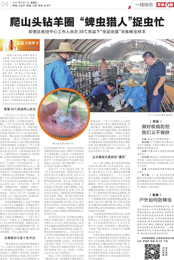 随着气温升高,病媒生物进入活跃期,以蜱虫为媒介的发热伴血小板减少综合征等疾病的发病风险大大增加。为了解蜱虫种群、分布以及季节消长规律,每年4月至9月,在荒郊野外、田头林间、牛棚羊圈里,都有一群“捉虫人”在忙碌着,他们就是疾控中心工作人员。昨天上午,为切实做好监测工作,即墨区疾控中心病媒消杀科和传防科工作人员来到鳌山卫街道监测点开展蜱虫监测工作。夏日炎炎,蜱虫如何捕捉?青岛早报记者跟访疾控人员,记录他们冒着酷暑、顶着热浪捉虫取样,用如雨的汗水和勤劳的双手筑牢人民健康防线的幕后故事。