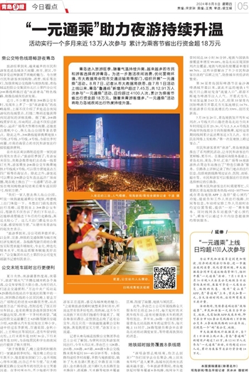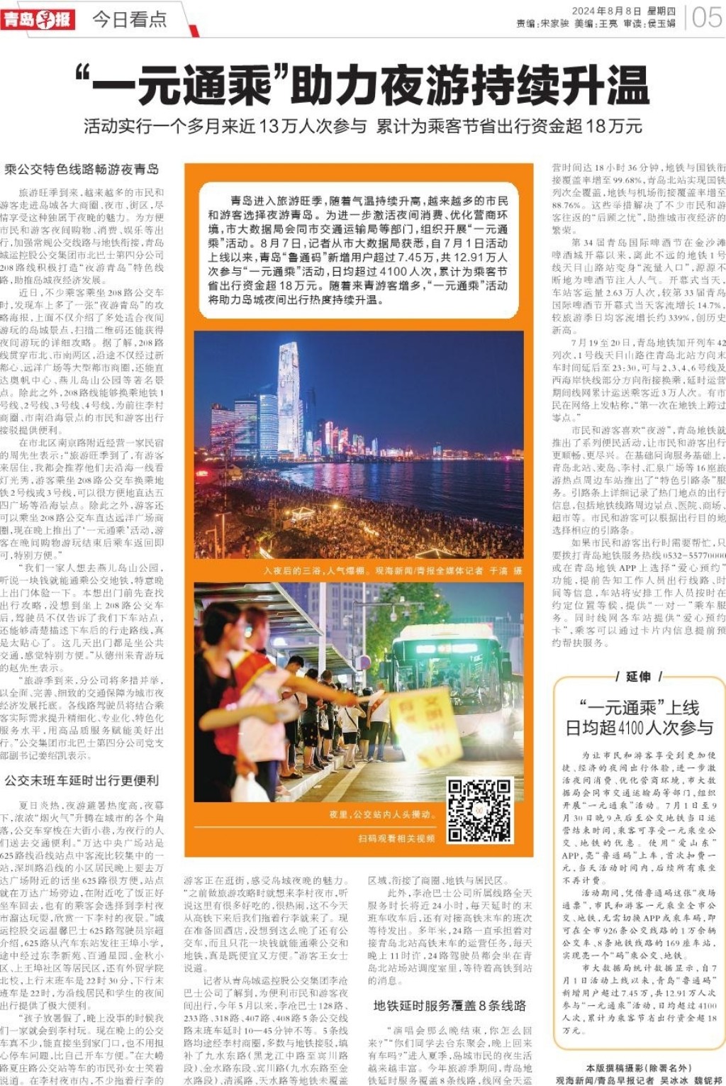 青岛进入旅游旺季,随着气温持续升高,越来越多的市民和游客选择夜游青岛。为进一步激活夜间消费、优化营商环境,市大数据局会同市交通运输局等部门,组织开展“一元通乘”活动。8月7日,记者从市大数据局获悉,自7月1日活动上线以来,青岛“鲁通码”新增用户超过7.45万,共12.91万人次参与“一元通乘”活动,日均超过4100人次,累计为乘客节省出行资金超18万元。随着来青游客增多,“一元通乘”活动将助力岛城夜间出行热度持续升温。