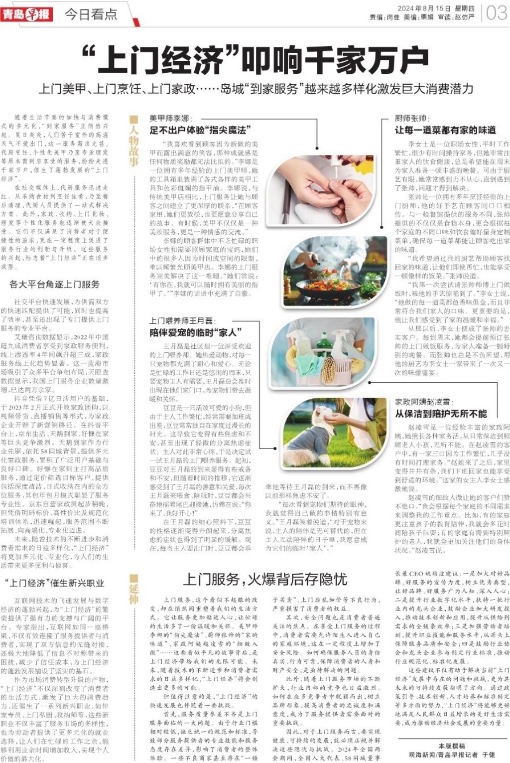 在社交媒体上,代厨服务迅速走红。从采购食材到烹饪佳肴,乃至餐后清理,代厨人员提供了一站式解决方案。此外,家政、收纳、上门化妆、理发等个性化服务也逐渐被大众接受。它们不仅满足了消费者对于便捷性的追求,更在一定程度上促进了服务行业的创新与升级。这些服务的兴起,标志着“上门经济”正在逐步成型。