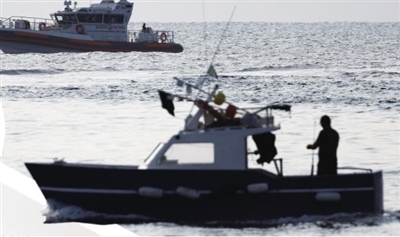 8月20日,救援人员(后)在意大利西西里大区首府巴勒莫附近海域展开搜救工作。