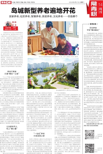 国家统计局日前公布的数据显示,2023年年末,我国60岁及以上人口超2.97亿,其中65岁及以上人口超2.17亿。根据国家卫健委的测算,预计“十四五”时期,我国60岁及以上人口总量将突破3亿,占比将超过20%。2035年,60岁及以上人口将增加到4.2亿左右,占比将超过30%。越来越多的老年人希望在退休后能够老有所养,安度晚年生活,日益增长的老年人口对养老体系、医疗服务、社会保障以及社区照护等方面提出了更高的要求,如何让老年人安享“夕阳人生”,确保他们在物质上得到保障、精神上获得关怀,已经成为一个愈发不容忽视的课题。目前岛城正不断探索多样化的养老模式,例如居家养老、社区养老、智慧养老、旅居养老、文化养老等各种形式的养老模式正在迅速发展,以满足不同老年群体的个性化需求。
