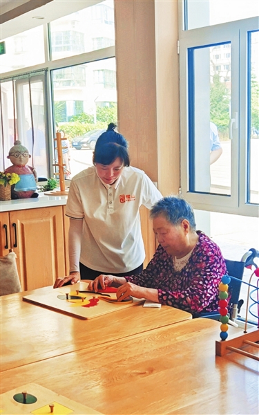 市北区辽源路街道综合养老服务中心内,工作人员细心为老人服务。