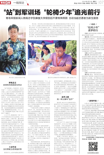 军训是一项艰苦且具有挑战性的任务,需要坚强的毅力和耐力才能完成。9月2日,康复大学首批300名新生为期两周的军训正式拉开帷幕。作为新生中的一员,青岛早报新闻人物——“轮椅少年”高志宇和同学们一起“站”到军训场地。而入学前,高志宇就表示会主动参加军训,他告诉青岛早报记者,军训一方面可以磨砺意志,另一方面也可以增加和同学之间的友谊。“希望通过参与军训这种高强度的训练,来挑战自我、突破极限,使自己变得更加坚强、勇敢,以便更好地应对未来生活中的各种困难和挑战。”高志宇和其他299名同学一起,共同书写着康复大学“历史的首页”。