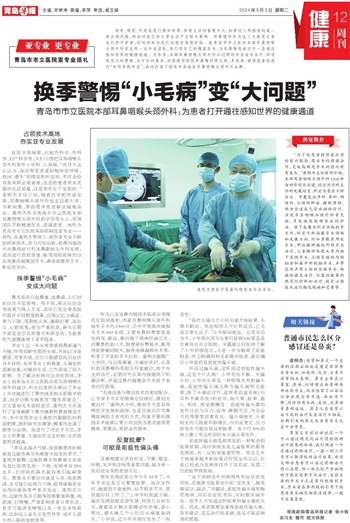 “青岛是海洋气候,每到换季的时候就是过敏性鼻炎和鼻窦炎高发的季节。”逄明杰提醒,过敏性鼻炎和鼻窦炎在青岛是比较常见的一个病,发病率在25%左右,长时间的鼻炎就容易引起鼻窦炎。鼻窦炎主要症状就是头疼、流浓鼻涕,还可能引起视力下降、眶周感染甚至是颅内感染等严重并发症。逄明杰介绍,过敏性鼻炎可能导致频繁地鼻塞、流清涕、打喷嚏,严重影响患者日常生活,甚至可能诱发哮喘以及一些全身性疾病,比如说儿童生长发育异常、成年人潜在的心脑血管损害等。