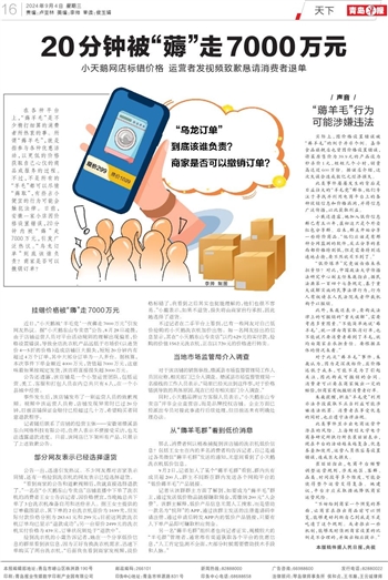 在各种平台上,“薅羊毛”是不少精打细算的消费者所热衷的事。所谓“薅羊毛”,就是指参与各种优惠活动,以更低的价格获取自己心仪的商品或服务的过程。不过,不是所有的“羊毛”都可以尽情“薅取”,有些占小便宜的行为可能会触犯法律。日前,安徽一家小店因价格设置错误,20分钟内被“薅”走7000万元,引发广泛热议。“乌龙订单”到底该谁负责?商家是否可以撤销订单?