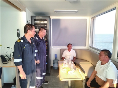两名落水渔民被救上“山港日照”轮后,船员给他们拿来了食物和水,帮助他们补充能量。经过交谈得知,这两位渔民驾驶一艘渔船出海捕鱼,不料航行途中螺旋桨部位突然漏水,“两位渔民说当时进水的速度很快,渔船很快就翻过来了,他们只好漂在海上,每人拿起一个塑料桶大声求救。”魏永华表示,当被“山港日照”轮船员发现时,两位渔民已经在海中漂浮了一个多小时。