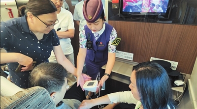 不久,一名医护人员赶来,对老人进行检查。得知老人有心脏病史后,这位医护人员指导杨欢和乘务员对她进行救护和病情观察。慢慢地,老人情况有所缓解。随后,杨欢通过电话向老人家人说明情况,并主动为老人预约北京南站的重点旅客服务。