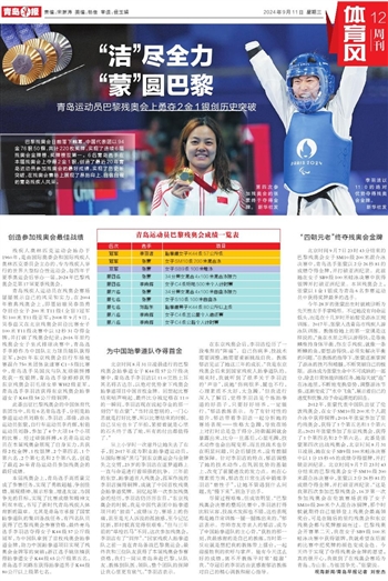 巴黎残奥会日前落下帷幕,中国代表团以94金76银50铜,共计220枚奖牌,实现了连续6届残奥会金牌榜、奖牌榜双第一。6名青岛选手在本届残奥会上夺得2金1银,创造了最近20年青岛运动员参加残奥会的最好成绩,实现了历史新突破,在残奥会赛场上展现了昂扬向上、自信自强的青岛残疾人风采。