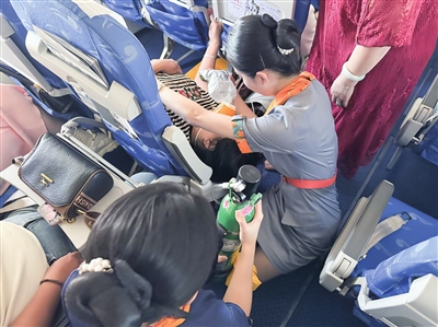 记者在当时拍摄的一段视频中看到,整个过程中,航班乘务人员全程陪护发病旅客,忙而不乱。参与救助的女医生和发病旅客家属一起按摩患者四肢,乘务人员则按照医生指示及时提供协助。时间在一分一秒地过去,随着急救措施逐步实施,患病旅客慢慢恢复了意识。