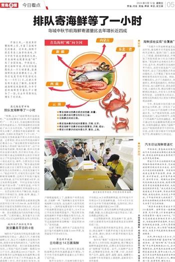 记者了解到,城阳水产品批发市场近日每天的海鲜发货量为1000多票,发货量是平日的4倍左右。