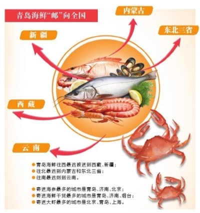 通过顺丰,青岛的海鲜往西最远被送到西藏、新疆,往北最远到内蒙古和东北三省,往南最远则到云南。