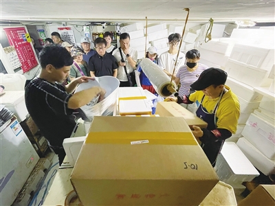 “其实我们抚顺路营业部离康定路农贸市场只有大约500米,如果市民觉得在市场里发货排队时间太长,可以步行到营业部发货,营业部的人手更充足一些。营业部最近每天的发件量大约是100票。”王拥军建议,发货量不太大的市民,可以买完海鲜到营业网点里发货。