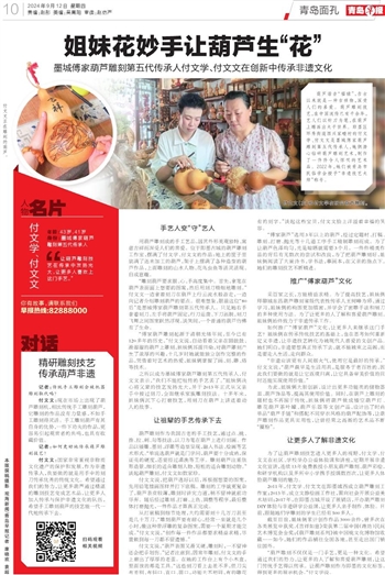 2011年,付文学、付文文在即墨城西成立葫芦雕刻工作室;2013年,成立文静绘画工作社,面向社会开展公益美术培训;2017年,在即墨古城开设了展销店,开办葫芦雕刻DIY体验与非遗研学公益课,让更多人亲手制作、体验。目前,跟随她们学雕刻的学生已经有500多人。