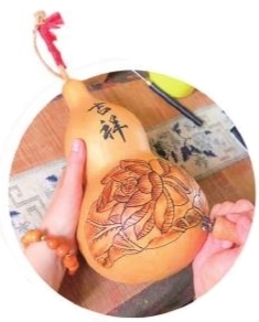 葫芦雕刻作为我国古老的手工技艺,通过点、挑、推、拉、刺、勾等技法,以刀为笔在葫芦上进行刻画。作品以镂雕、墨刻、浮雕等造型呈现,融入书法、绘画等艺术形式。“单说选葫芦就是门学问,葫芦要十分成熟,保证壳的硬度,还要经过清洗等工序。雕刻葫芦注重依形造景,细长的适合雕刻人物,短粗的适合雕刻动物。”谈起葫芦雕刻,付文文如数家珍。