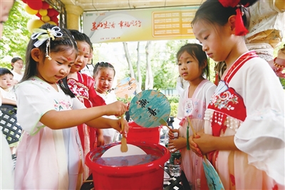 活动现场,身穿汉服华裳的青岛市技师学院的学生志愿者带领居民中秋游园,一起体验投壶、猜灯谜、剪纸、衍纸等传统文化活动。参与制作漆扇的居民李先勇表示,“开‘盲盒’般的漂漆技艺让人惊艳,大家做出来的效果都不一样,都是独一无二的,不仅是一次文化体验,更是一份专属于自己的珍贵礼物。”