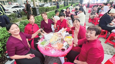 红烧鸡块、糖醋排骨、油焖大虾、麻辣小龙虾、可乐鸡翅……居民纷纷从家里带来自己做的拿手菜,大家围坐在一起边唠家常边品“百家菜”,现场洋溢着浓浓的邻里情。“物业为我们准备了饮料、水果、月饼等,现场还有精酿啤酒,这服务太棒了。”居民纪先生说。