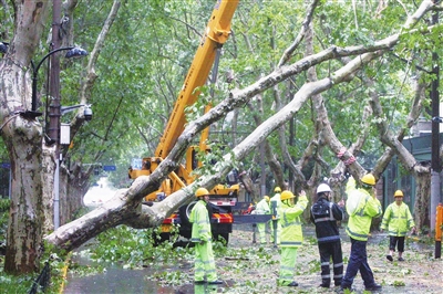 9月16日,维护人员在处理倒在上海衡山路的树木。
