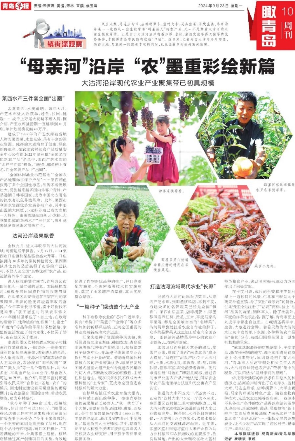 瓦庄大梨、马连庄甜瓜、店埠胡萝卜、蓝村大米、灵山韭菜、平度生姜、马家沟芹菜……这些从一出生就带着“明星范儿”的农产品,无一不是靠着大沽河的水源生根发芽的。正是由于大沽河沿岸有着沙厚、水好、灌溉发达等得天独厚的优势条件,才使得青岛市民能有这般“口福”。连日来,记者走访大沽河沿岸即墨、莱西大地,与农民一同感受丰收的同时,也见证着乡村振兴新风新貌。